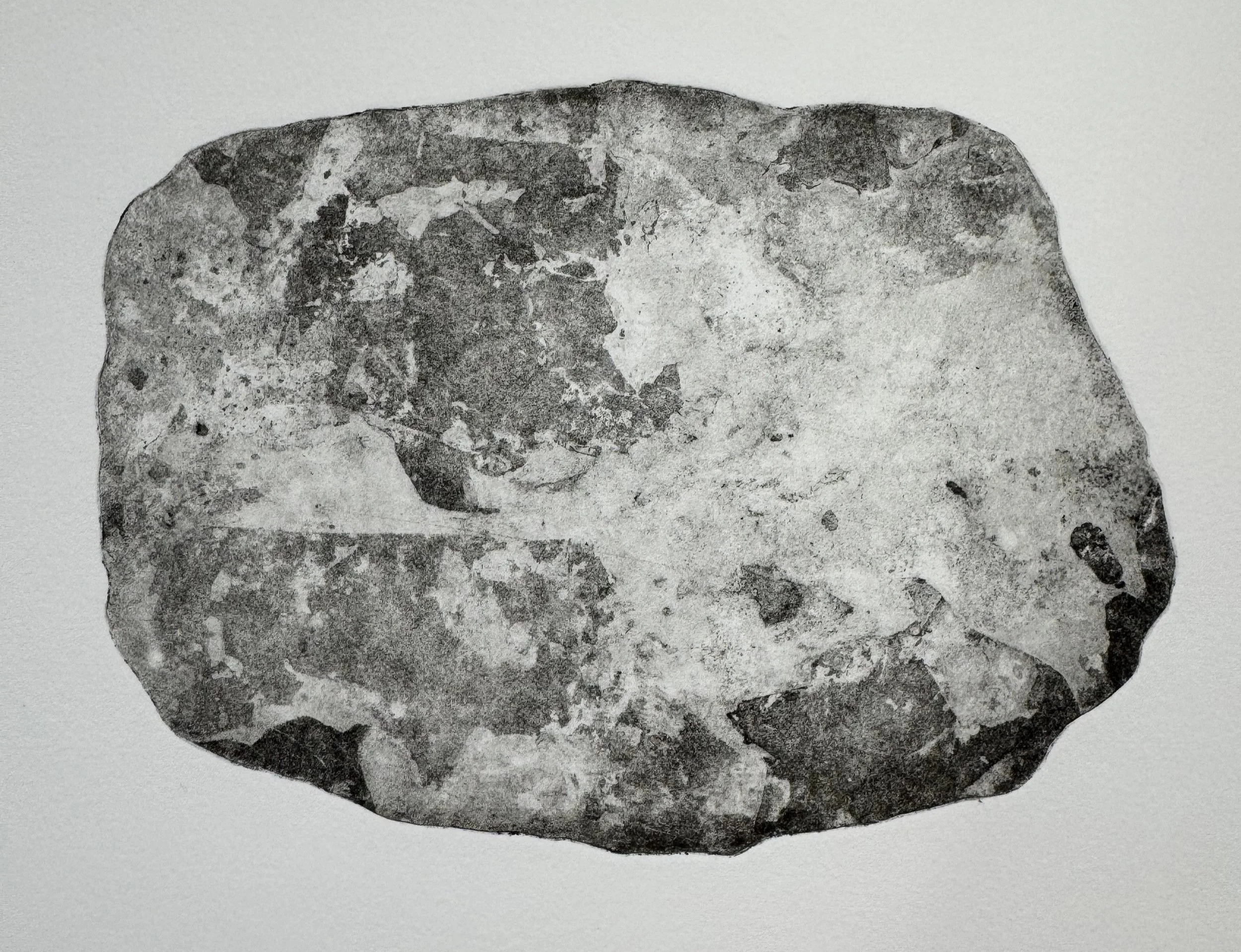 The shaped etching plates have been printed as stacked cairns which often mark memorials or as abstract collections mirroring the inclination to impose order on the natural world. Printing plates range in size from 1” to 11” and are each shaped by hand using a jeweler’s saw. A rosin aqautint is applied before plates are etched using a resist applied with a marbling technique.